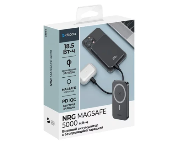 Внешний АКБ 5000 mAh NRG MagSafe, QI 20W, Deppa, дисплей, черный, 33664 в Красноярске